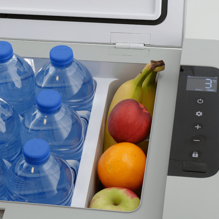 Use a Mestic compressor cooler to cool or freeze food and drinks regardless of the ambient temperature. Both on the road and at your sunny destination. The included car charger allows you to easily connect the Mestic MCC-25 to 12/24 V. With the adapter, you can connect the cooler to a 230 V socket. The adapter is included with the MCC-25, but is also available separately. The cooler will perform just as well wherever you use it. You can set the desired temperature between -18 °C and +10 °C on the digital display. The compressor cooler even has a USB port, which is handy for charging your phone, for example!