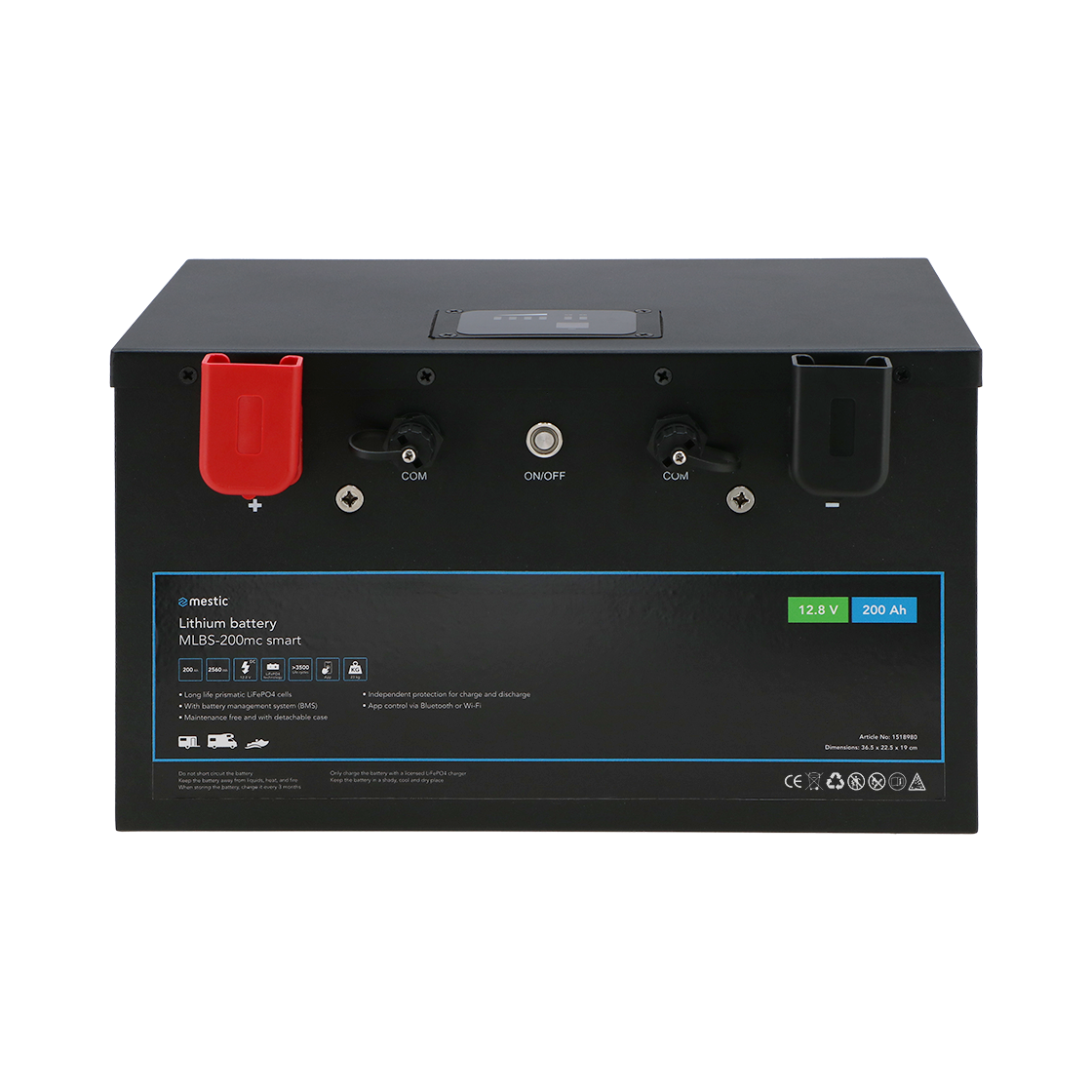 The MLBS-200mc smart is a 200 Ah lithium battery equipped with high-quality LiFePO4 cells for top performance and long life. The integrated Battery Management System (BMS) continuously protects the battery from overcharging, overheating and deep discharge. Thanks to the built-in heating function, you can charge the battery even in temperatures down to -20 °C. The battery also lasts extra long with more than 3,500 charging cycles at 100% discharge.