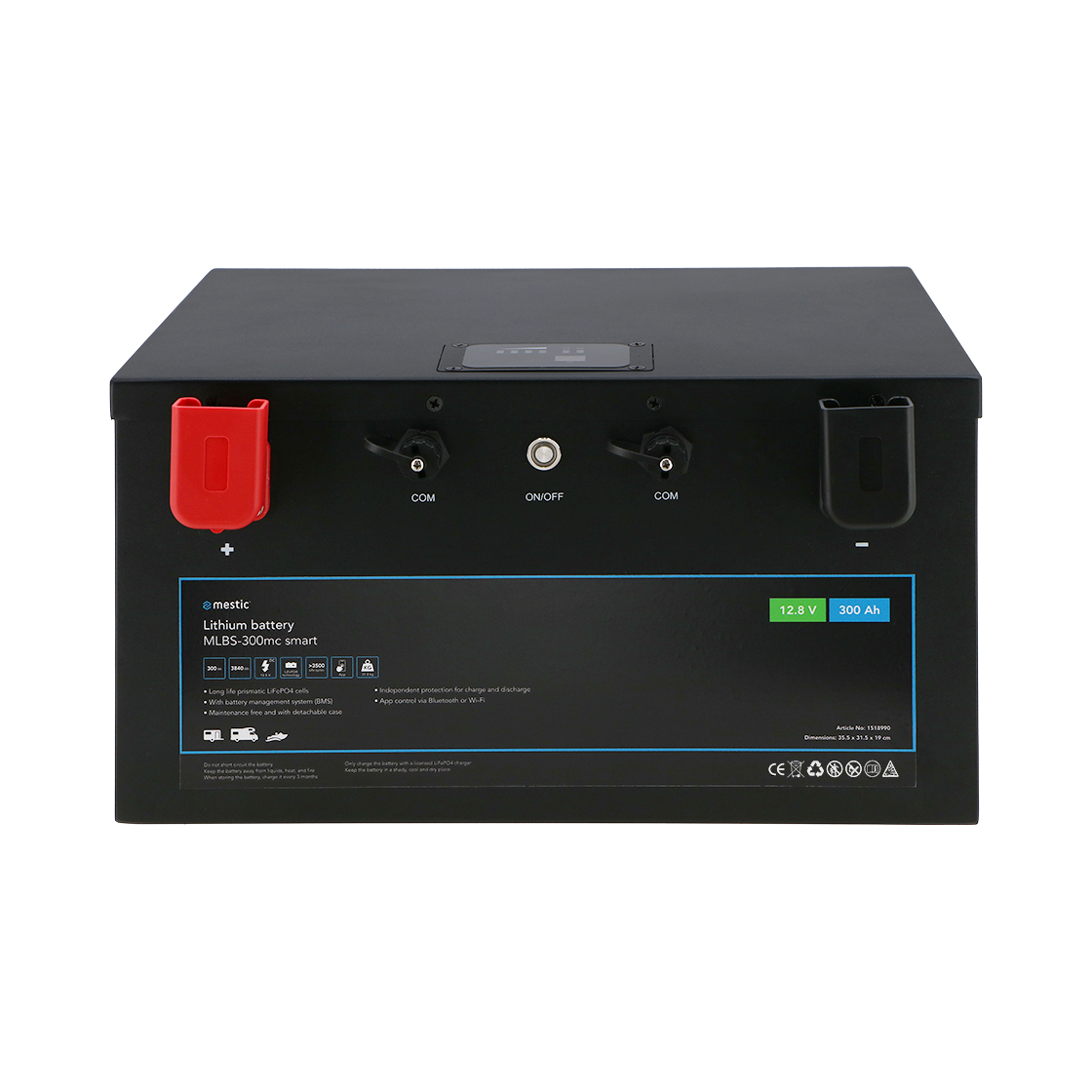 The MLBS-300mc smart is a 300 Ah lithium battery equipped with high-quality LiFePO4 cells for top performance and long life. The integrated Battery Management System (BMS) continuously protects the battery against overcharging, overheating and deep discharge. Thanks to the built-in heating function, you can charge the battery even in temperatures down to -20 °C. The battery also lasts extra long with more than 3,500 charging cycles at 100% discharge.